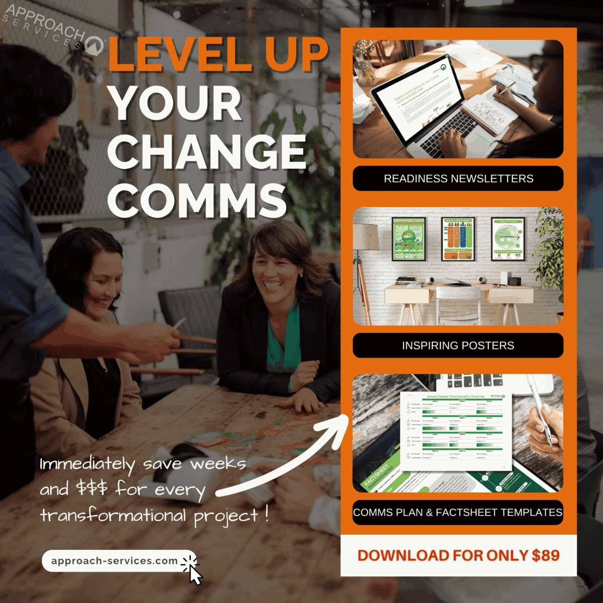 Launch your change communication with ready-to-use posters, editable templates, and copywritten newsletters. Save time, look professional, and drive real engagement — all for just $89