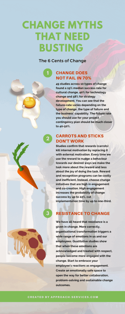 These three make the top of our change-myth-that-need-busting-list. Why? Because they are an outdated recipe for a messy transition. They stifle motivation and collaboration. And, ultimately set organisations up to fail in delivering successful change.